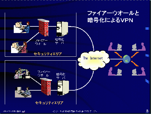 それではVPNというもので一体どんなことができるかといいますと、まず、オフィスが何カ所かに分かれている場合でも、専用線をわざわざ引かなくてもWebと電子メールだけで共同作業が可能になります。また、SOH0(Small office Home Office)のように自宅やリゾートオフィスで仕事をする場合や、クライアントと共同でものをつくっていく場合のやりとりにも有効であり、暗号化を施して守秘性さえ守れぱ、時間と場所に左右されない非常に便利な手段といえます。すべての必要テータが社内のイントラネットに蓄積されていると出張先から見れないという問題もありますが、急がない情報はメールで概要だけ伝えるという具合に使い分けるとよいでしよう。